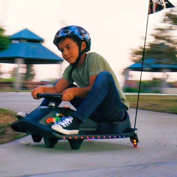 Met een verborgen topsnelheid regeling kunnen ouders de juiste maximumsnelheid voor hun kind selecteren. 4 km/u voor de jonge beginner en 13 km/u voor de jonge, gevorderde bestuurder. En de meerkleurige LED-lampjes langs beide zijden van het chassis, en de zwenkwielen achter, lichten op wanneer de Cart aan het rijden is.