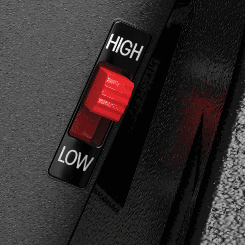 – Regelschakelaar topsnelheid – hiermee kunnen ouders de topsnelheid selecteren die zij geschikt achten voor hun kind: 13 km/u in de standaardinstelling “HOOG” of 4 km/u in de optionele instelling “LAAG”